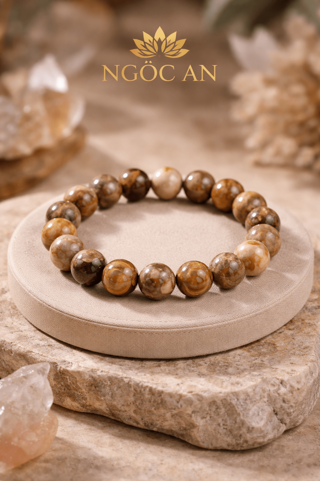 Vòng gỗ hóa thạch Ngọc An là sự kết tinh kỳ diệu của thiên nhiên qua hàng triệu năm, mang vẻ đẹp độc đáo với từng vân gỗ hóa đá tự nhiên không hạt nào giống hạt nào. Sản phẩm sở hữu tông màu nâu, vàng, xám sang trọng, phù hợp cho cả nam và nữ, dễ dàng phối cùng nhiều phong cách thời trang.